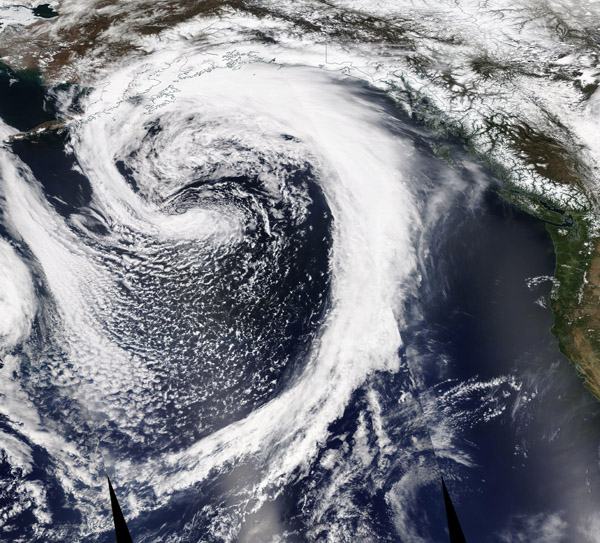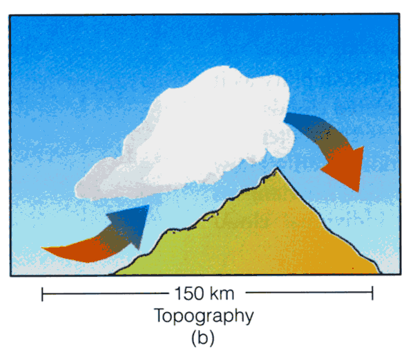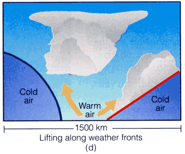 A low pressure system causes air to converge (moving towards the center of the system) and rise on a large scale (100’s of kilometers).
