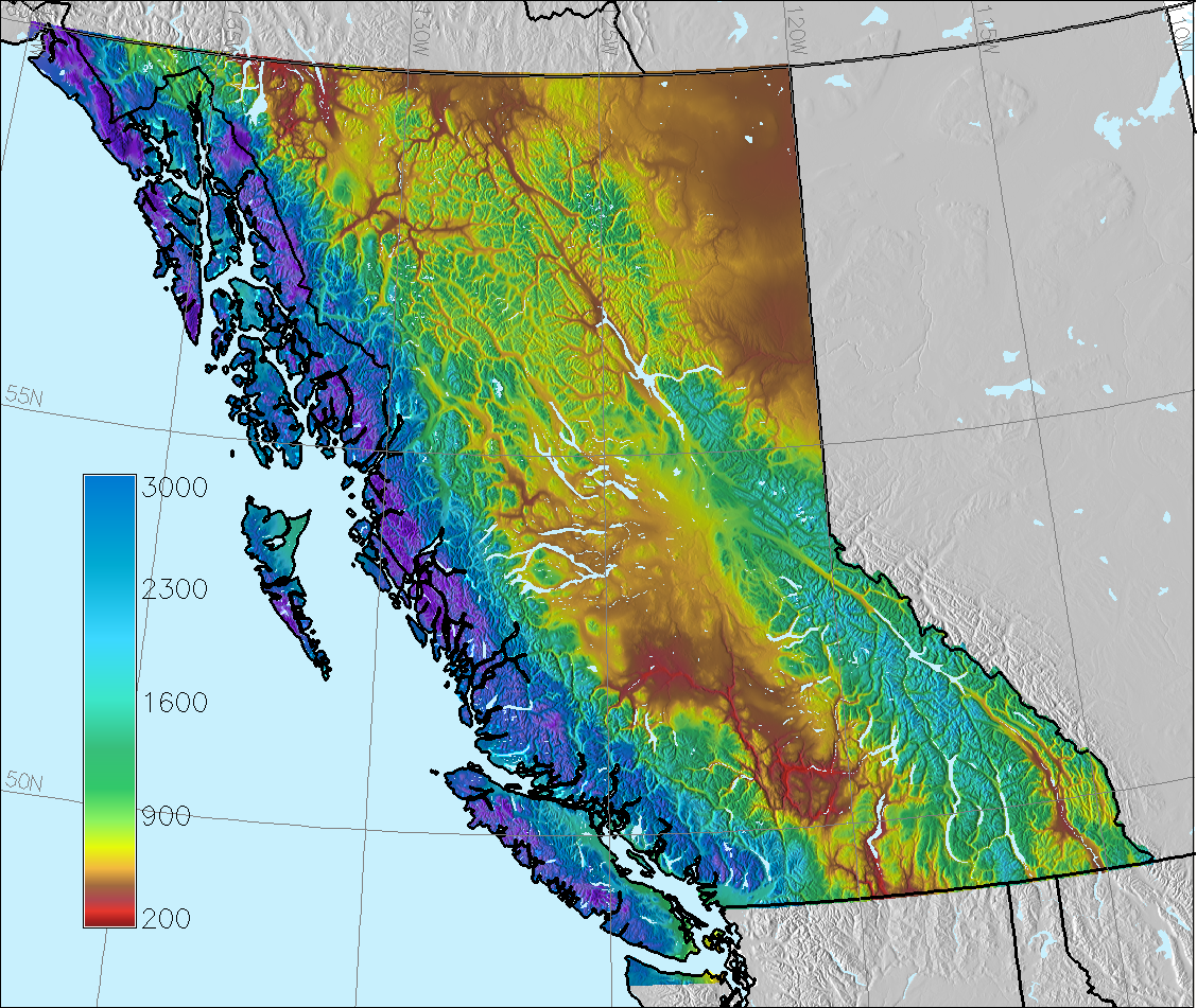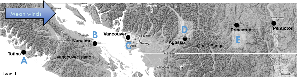 Heavy precipitation on westerly slopes, warmer drier on easterly side (Gulf Islands, Sunshine coast, Okanagan).