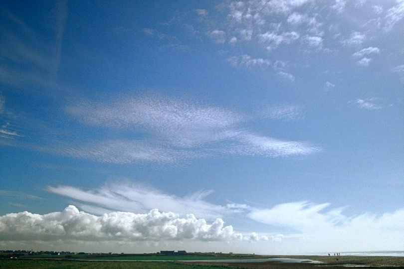 A range of different clouds is represented on this picture - ice clouds (cirrus) and liquid water colds (cumulus) Photo: A. Christen
