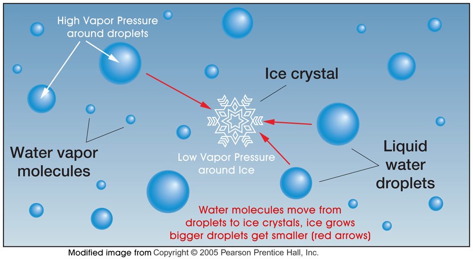 Saturation vapor pressure is slightly lower around ice crystals than water droplets; ice has tighter bonds than liquid water.