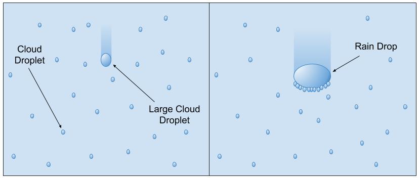 Larger droplets fall faster than smaller ones and collide and combine with them. After many collisions, large droplets are big enough to overcome updrafts and survive evaporation on the way down.