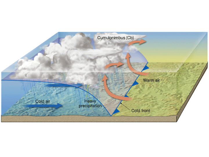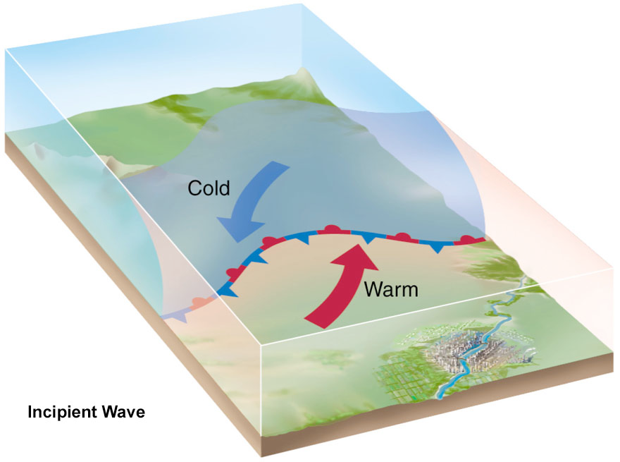 We distinguish between cold fronts (cold air undercuts warm air) and warm fronts (where warm air rides up over colder air ahead of it)