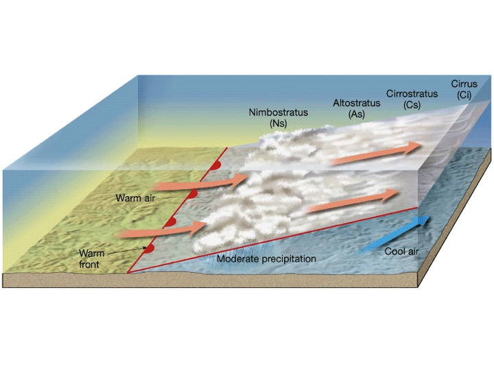 Finally nimbostratus clouds and precipitation once the frontal boundary is close enough