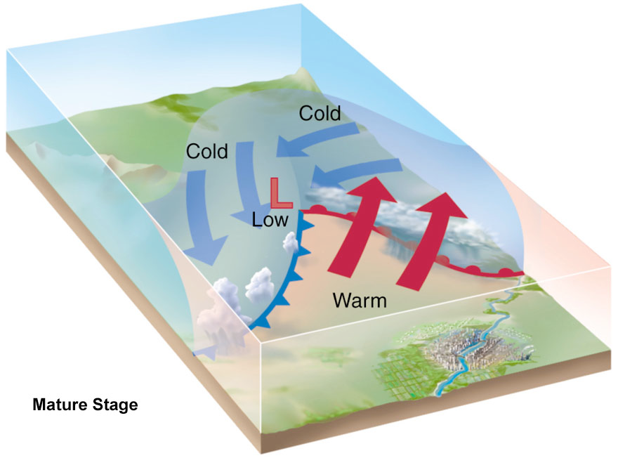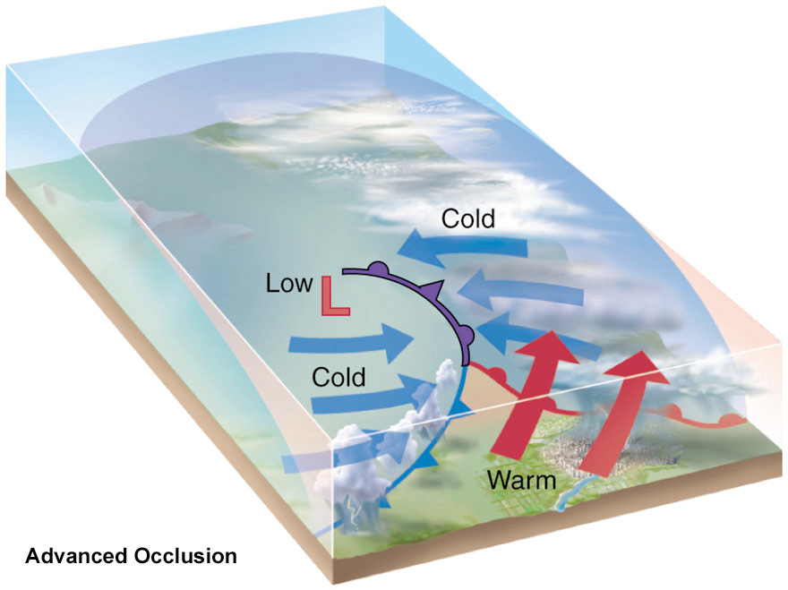 The occluded stage begins when the cold front catches up with the warm front near the low pressure center.
