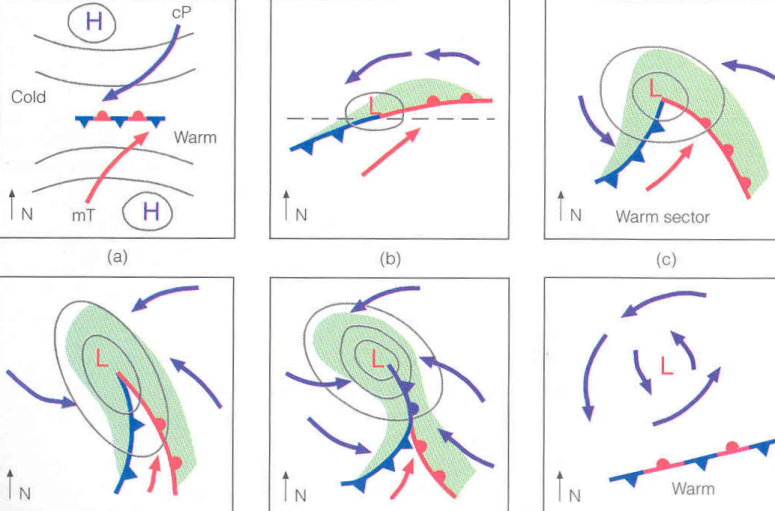 Stage starts with a relatively stationary front separating polar (cold) and subtropical (warm) air masses.