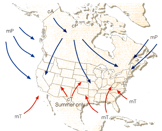 Which of the air masses listed below would be #1 and #2 respectively in the figure below?