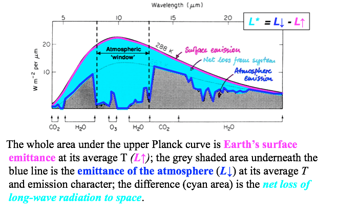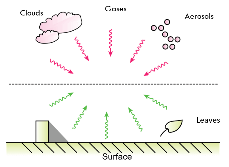Long-wave radiation is emitted from Atmosphere (gases, aerosols, droplets) and surface at ambient temperatures.