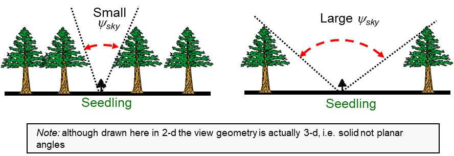 The view of the sky from an object (sky view factor; \(\psi_{sky}\)) is significant in quantifying Long-wave exchange at night. + The sky is usually ‘cold’ and an effective heat sink