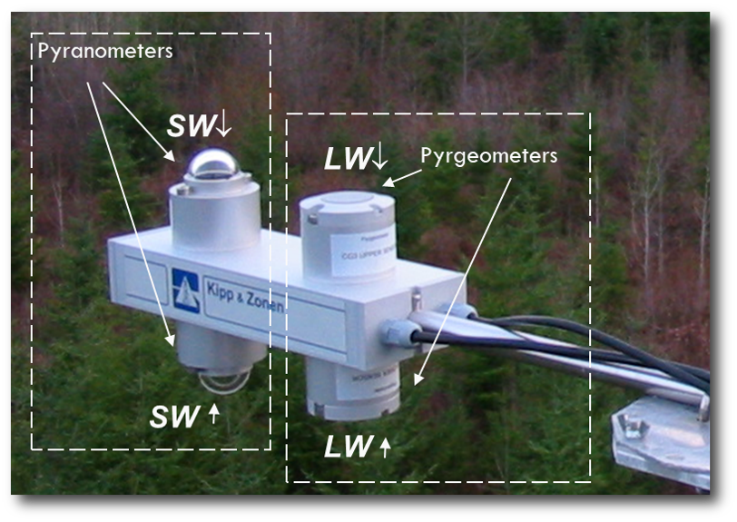 The net long-wave radiation flux density (\(LW^*\)) at the surface is the difference between the input from the atmosphere above (\(LW\downarrow\)) and the output surface (\(LW\uparrow\)).