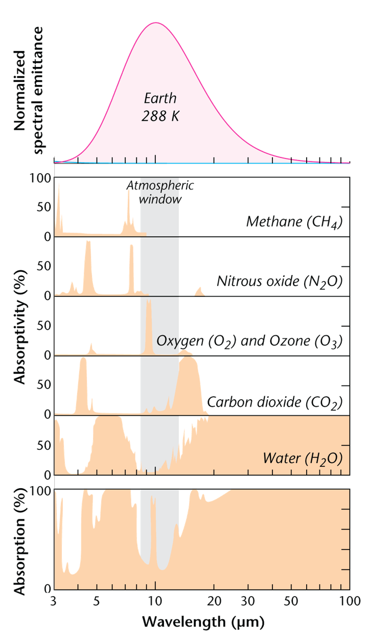 Kirchhoff’s Law tells us that since atmospheric absorption is concentrated at these wavelengths so is atmospheric emission.